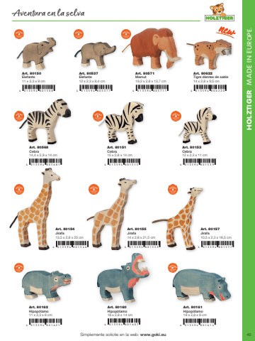 49HOLZTIGER MADE IN EUROPE.4 0 1 3 5 9 4 805 711 4 0 1 3 5 9 4 806 2 2 04 0 1 3 5 9 4 8 0 1 5 4 64 0 1 3 5 9 4 8 0 1 6 2 1 4 0 1 3 5 9 4 8 0 1 6 0 7 4 0 1 3 5 9 4 8 0 1 6 1 44 0 1 3 5 9 4 8 0 1 553 4 0 1 3 5 9 4 8 0 1 5 7 74 0 1 3 5 9 4 80568 1 4 0 1 3 5 9 4 8 0 1 5 1 54 0 1 3 5 9 4 8 0 1 5084 0 1 3 5 9 4 8 0 1 5 3 94 0 1 3 5 9 4 8053 7 7Simplemente solicite en la web: www.goki.euAventura en la selvaArt. 80151Cebra 15 x 2,8 x 14 cmArt. 80153 Cebra 12 x 2,3 x 11 cmArt. 80568 Cebra14,4 x 2,8 x 14 cmArt. 80150 Elefante 11 x 2,3 x 9 cmArt. 80154Jirafa13,5 x 2,8 x 25 cmArt. 80155 Jirafa 14 x 2,8 x 21,5 cmArt. 80157 Jirafa 10,5 x 2,3 x 16,5 cmArt. 80571Mamut19,2 x 2,8 x 13,7 cmArt. 80622Tigre dientes de sable 14 x 2,8 x 9,5 cmArt. 80537Elefante12 x 2,3 x 8,4 cmArt. 80160Hipop%u00f3tamo18 x 2,8 x 14 cmArt. 80161 Hipop%u00f3tamo18 x 2,8 x 9 cmArt. 80162 Hipop%u00f3tamo11 x 2,3 x 6 cm