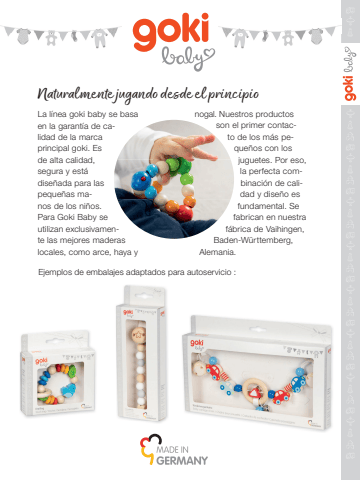 La l%u00ednea goki baby se basa en la garant%u00eda de calidad de la marca principal goki. Es de alta calidad, segura y est%u00e1 dise%u00f1ada para las peque%u00f1as manos de los ni%u00f1os. Para Goki Baby se utilizan exclusivamente las mejores maderas locales, como arce, haya y nogal. Nuestros productos son el primer contacto de los m%u00e1s peque%u00f1os con los juguetes. Por eso, la perfecta combinaci%u00f3n de calidad y dise%u00f1o es fundamental. Se fabrican en nuestra f%u00e1brica de Vaihingen, Baden-W%u00fcrttemberg, Alemania.Ejemplos de embalajes adaptados para autoservicio :Naturalmente jugando desde el principio