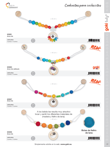 774 013594 6536024 013594 6536714 013594 652612< 40 cm >< 40 cm >< 40 cm >4 013594 653565< 40 cm >4 013594< 40 cm >< 40 cm >< 40 cm >4< 40 cm >Simplemente solicite en la web: www.goki.eu65360Arco iris veh%u00edculo65367Arco iriscada pieza0 piezas | 10 piezascada pieza0 piezas | 10 piezas65261Arco iriscada pieza0 piezas | 10 piezas65356Arco iriscada pieza0 piezas | 10 piezasA los beb%u00e9s les resulta muy atractivo tocar y sentir los diferentes materiales de (madera y fi eltro de lana).Bolas de fi eltro de lanaCadenitas para cochecitos