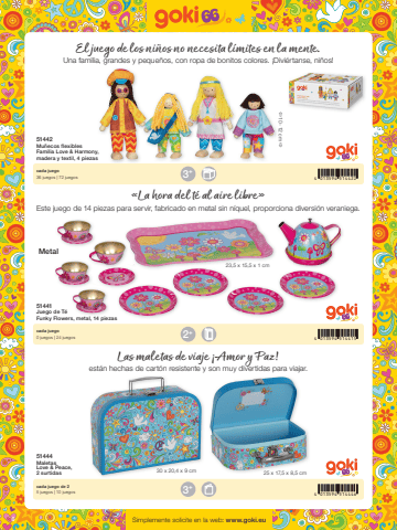 64 013594 5144224 013594 5144154 013594 5144463+2+3+%u00ef 10 - 12 cm %u00f023,5 x 15,5 x 1 cm30 x 20,4 x 9 cm 25 x 17,5 x 8,5 cmSimplemente solicite en la web: www.goki.eu51442Mu%u00f1ecos flexiblesFamilia Love & Harmony, madera y textil, 4 piezas51441Juego de T%u00e9 Funky Flowers, metal, 14 piezas51444Maletas Love & Peace, 2 surtidascada juego36 juegos | 72 juegoscada juego0 juegos | 24 juegoscada juego de 25 juegos | 10 juegosEl juego de los ni%u00f1os no necesita l%u00edmites en la mente. Una familia, grandes y peque%u00f1os, con ropa de bonitos colores. %u00a1Divi%u00e9rtanse, ni%u00f1os!%u00abLa hora del t%u00e9 al aire libre%u00bb Este juego de 14 piezas para servir, fabricado en metal sin n%u00edquel, proporciona diversi%u00f3n veraniega.Las maletas de viaje %u00a1Amor y Paz! est%u00e1n hechas de cart%u00f3n resistente y son muy divertidas para viajar. Metal