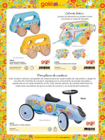 74 013594 558297 4 013594 5483974 013594 5377041+ 1+10 x 5,5 x 6,5 cm18 x 5,5 x 12 cm4 01359473,5 x 35 x 40 cm1+ max.25 kgSimplemente solicite en la web: www.goki.eu55829Furgoneta para agarre Ibiza, madera, 2 modelos54839Furgoneta Camper para empujar53770Correpasillo, en metal, pl%u00e1sticocada muestrario de 832 piezas | 64 piezascada pieza12 piezas | 24 piezascada pieza0 piezas | 1 piezaColorido, l%u00fadicoporque los elementos se pueden mover y accionar la rueda de repuesto.Puro placer de conducir.Este moderno veh%u00edculo correpasillos de metal encarna sin duda el estilo de vida positivo y alegre de los a%u00f1os 60. Divertido de conducir, impulsado por la %u00fanica fuente de energ%u00eda renovable y respetuosa con el medio ambiente: el ni%u00f1o. Este robusto veh%u00edculo de carreras est%u00e1 hecho de metal, tiene neum%u00e1ticos de goma, es f%u00e1cil de conducir y sin duda llamar%u00e1 la atenci%u00f3n.Metal