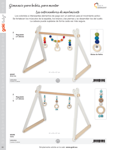 904 013594 6535724 013594 65296461 x 55 x 57 cm61 x 55 x 57 cmSimplemente solicite en la web: www.goki.eu65357Arco iris65296Osito cada pieza0 piezas | 8 piezascada pieza0 piezas | 8 piezasLos entrenadores de mff imientoLos coloridos e interesantes elementos de juego son un est%u00edmulo para el movimiento activoSe fortalecen los m%u00fasculos de la espalda, los brazos y las piernas y se desarrollan los del cuello. La cabeza puede sujetarse de forma cada vez m%u00e1s segura.Gimnasio para beb%u00e9s, para montarRegulablea 4 alturasRegulablea 4 alturasBolas de fieltro