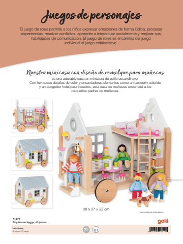 4 013594 51477438 x 27 x 33 cm3+51477Tiny House Hygge, 40 piezascada juego0 juegos | 1 juegoEl juego de roles permite a los ni%u00f1os expresar emociones de forma l%u00fadica, procesar experiencias, resolver confl ictos, aprender a interactuar socialmente y mejorar sus habilidades de comunicaci%u00f3n. El juego de roles es el camino del juego individual al juego colaborativo.Juegos de personajesNuestra minicasa con dise%u00f1o de remolque para mu%u00f1ecas es una adorable casa en miniatura de estilo escandinavo. Con hermosos detalles de color y encantadores elementos como un bander%u00edn colorido y un acogedor hotel para insectos, esta casa de mu%u00f1ecas encantar%u00e1 a los peque%u00f1os padres de mu%u00f1ecas.sin mu%u00f1ecos articulados